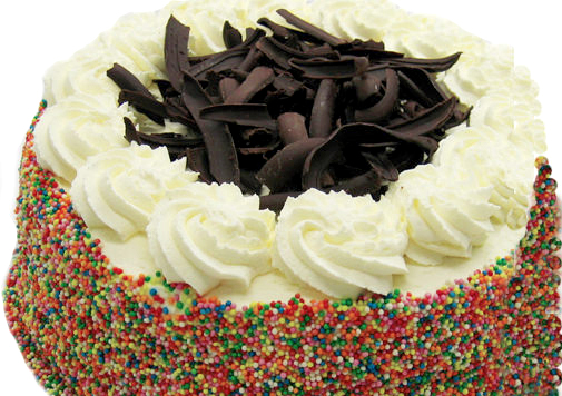 Delicate vanilla sponge layered with creamy Neapolitan (Chocolate, strawberry, vanilla) ice cream. Sides of ‘Hundreds & Thousands’ and topped with curls of Swiss Chocolate. I scream for ice cream!