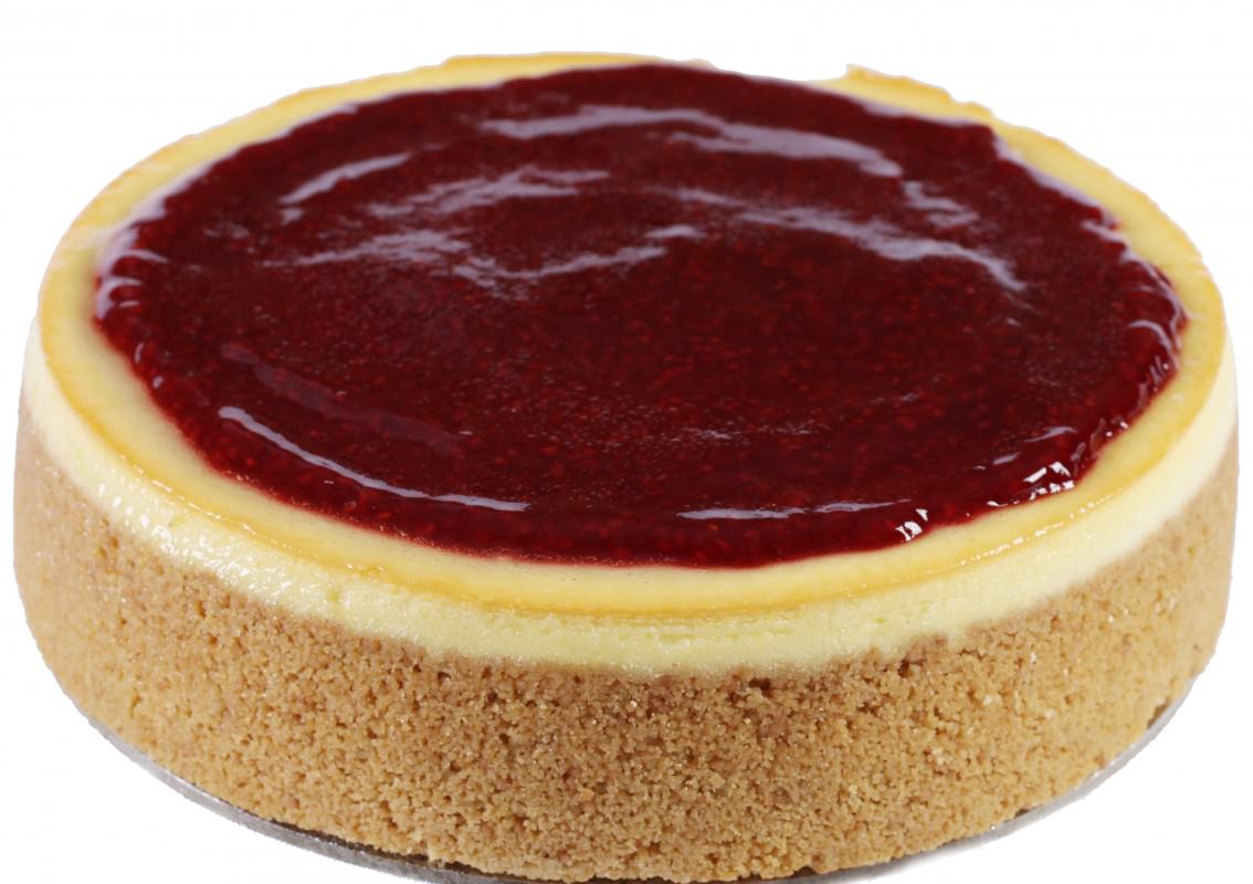 Fresh pureed raspberries atop a smooth baked cheesecake with a traditional biscuit crumb base.
